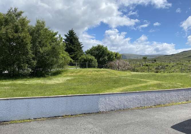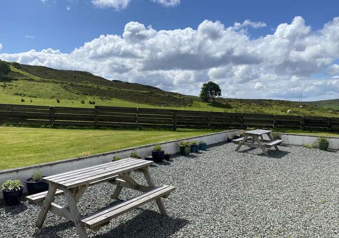 There is a large garden with picnic tables. We don’t get many midges up here at the top of the Township, so it’s very pleasant early evening; if you stay up a wee while longer, you can watch the sun set over Loch Snizort with the Isle of Lewis in the Outer Hebrides in the distance.